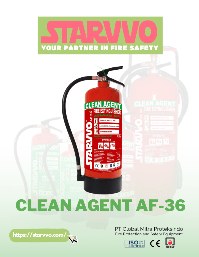 Starvvo dengan bangga menawarkan dua jenis clean agent fire extinguisher, AF-11 dan AF-36. Fire extinguisher ini menggunakan bahan kimia khusus yang dengan cepat memadamkan api tanpa meninggalkan residu atau produk sampingan yang berbahaya, menjadikannya ideal untuk melindungi peralatan sensitif dan area kritis.