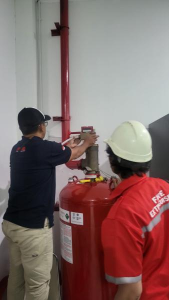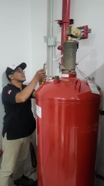 Setelah tangki dikosongkan, teknisi kami akan mengisi ulang tangki dengan gas FM200 baru. Proses ini dilakukan dengan alat khusus yang memastikan pengisian dilakukan dengan tekanan yang tepat.