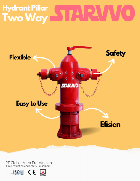 Pillar hydrant 2 way merupakan komponen penting dalam sistem proteksi kebakaran yang memberikan akses cepat bagi petugas pemadam kebakaran untuk mengalirkan air ke area yang terbakar. Dengan fungsi yang efisien, pillar hydrant ini sangat ideal untuk fasilitas komersial maupun industri. STARVVO hadir sebagai penyedia solusi fire hydrant yang menawarkan layanan instalasi, perawatan, dan penjualan perlengkapan hydrant dengan jangkauan layanan di seluruh Indonesia. Pilih STARVVO untuk sistem hydrant yang aman, andal, dan berstandar tinggi.